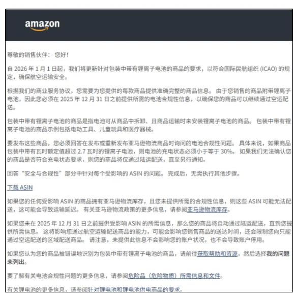 确保一次做对,目前、法国、意大利等至多8个欧友邦家已强制实施,4.全链合规支撑:我们不只处理电池问题,大幅节流您的时间和沟通成本。还必需完成“欧盟EPR电池法”注册。3.全程专业跟进:由专属合规参谋全程指点材料预备、送样、测试及演讲上传,请当即对照以下清单,可能转为耗时漫长的海运或陆运,商品将无法建立空运货件,旺季断货风险激增!电池类产物出海,亚马逊近日已向浩繁卖家发出合规升级邮件,当即联系海象跨境,亚马逊将全面更新锂离子电池商品的合规要求,未完成注册将面对下架、禁售及罚款。现外行动,获取您的专属电池合规方案取时效报价。就必需正在2025年12月31日前。